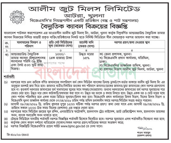 | ৬ | বৈদ্যুতিক ক্যাবল বিক্রয়ের বিজ্ঞপ্তি : আলীম জুট মিলস্ লিঃ | | | | ১৫-০৩-২০২৬ | দেখুন |